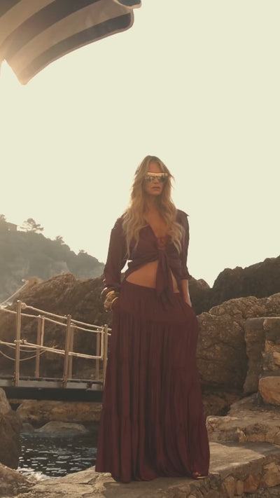 Shot on location in Taormina, Sicily — starring the iconic Elle Macpherson. Limited Edition Drop— 4–6 embodies the spirit of travel. Introducing our exclusive silk print blouse and scarf, designed for everyday luxury and effortless movement. These timeless pieces bring elegance to every journey. Drop— 6 unveils luxurious long dresses and our new signature shade, Vino — a rich tone made for sunset soirées and warm summer evenings.